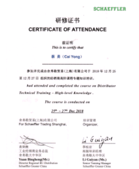 蔡勇2018年舍弗勒培訓(xùn)研修證書