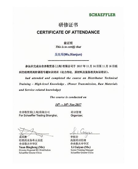 吳先軍2017年舍弗勒培訓(xùn)研修證書
