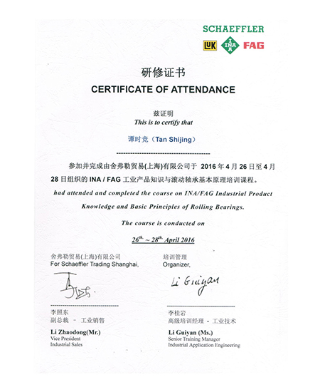 譚時(shí)競(jìng)2016年舍弗勒培訓(xùn)研修證書